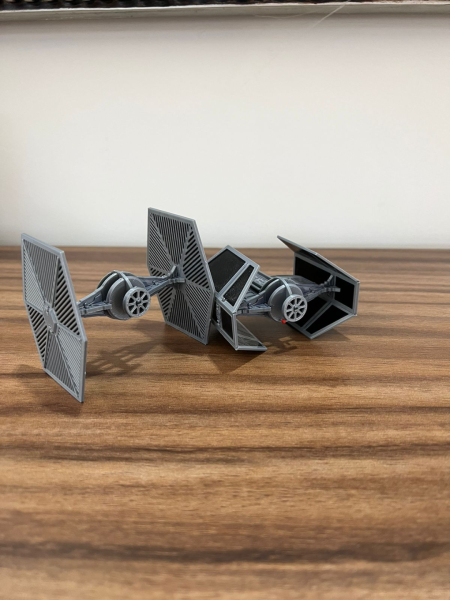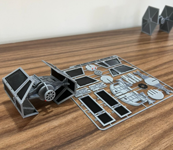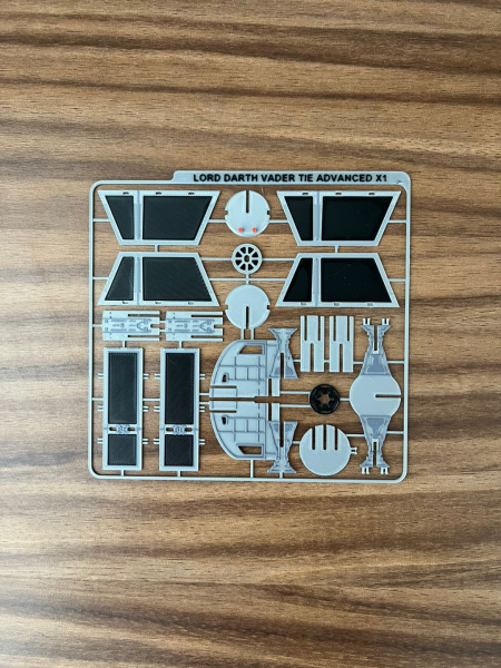 Cada componente está dispuesto en una tarjeta plana tipo maqueta, que permite desprender las piezas cuidadosamente y ensamblarlas sin necesidad de pegamento. El diseño mantiene las proporciones y detalles característicos del TIE Advanced X1, incluyendo las icónicas alas curvas y la cabina central reforzada.