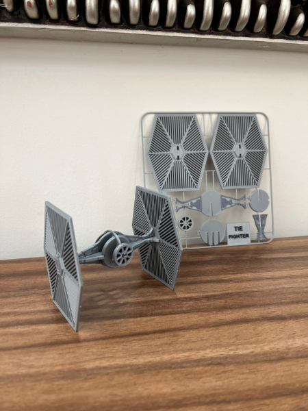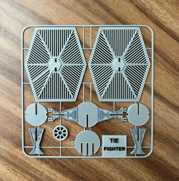Cada pieza viene integrada en una tarjeta plana de montaje, desde la cual se desprende cuidadosamente para su armado. Las partes encajan con precisión, permitiendo construir la silueta completa del TIE Fighter sin necesidad de adhesivos.