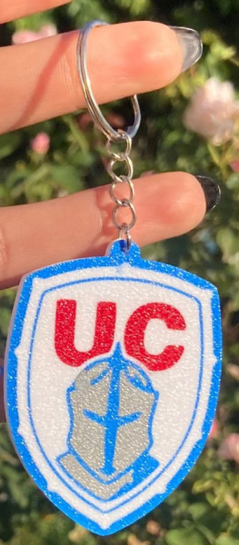 Este llavero combina la pasión por Universidad Católica con un diseño de carácter y estilo. Con forma de escudo, presenta un casco de caballero medieval al centro acompañado de las letras UC, simbolizando fuerza, tradición y orgullo cruzado.