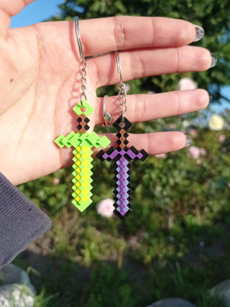 El llavero de la espada encantada de Minecraft representa el poder y la evolución dentro del mundo cúbico. Impreso en 3D con alta precisión, este diseño captura el aspecto de las armas mejoradas del juego, reconocibles por su característico brillo morado.