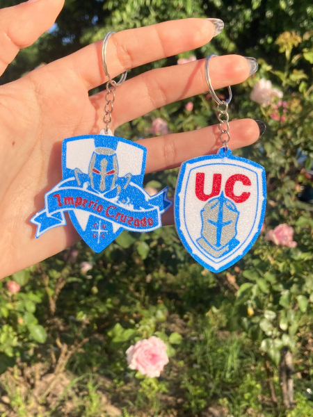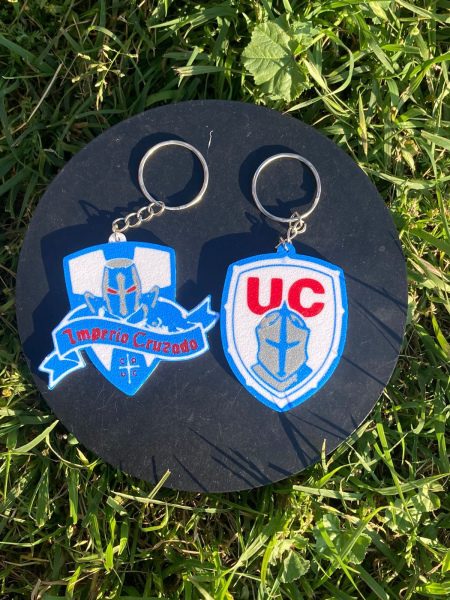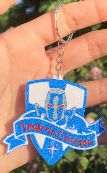 Este llavero es una declaración de fidelidad al Imperio Cruzado. Con diseño en forma de escudo, destaca la figura de un caballero medieval al fondo, acompañado por un lienzo con la frase Imperio Cruzado al frente.