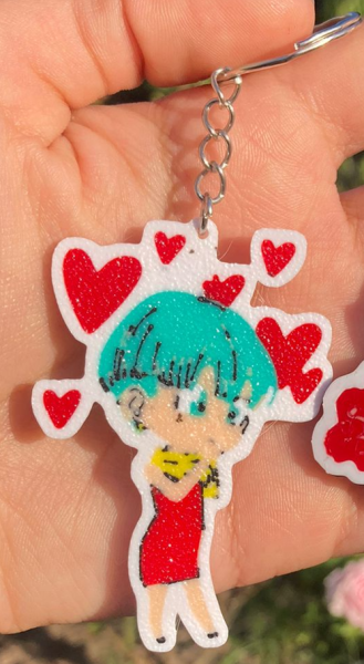 Este llavero impreso en 3D presenta a Bulma en una escena llena de ternura, rodeada de corazones y recibiendo un ramo de flores. Su diseño captura el lado más dulce y romántico de uno de los personajes más queridos de Dragon Ball Z.