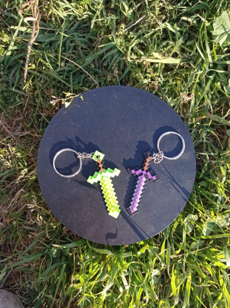 El llavero de la espada encantada de Minecraft representa el poder y la evolución dentro del mundo cúbico. Impreso en 3D con alta precisión, este diseño captura el aspecto de las armas mejoradas del juego, reconocibles por su característico brillo morado.